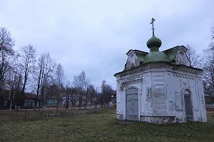 На площади уцелела лишь каменная часовня, построенная в 1879-1882 годах на средства купца П.В.Дубровина. А когда-то кроме храмового комплекса здесь были деревянные торговые ряды и деревянные соляные магазейны с галереями.