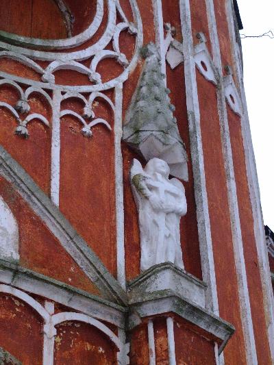 Так и хочется приглядется к деталям белокаменной отделки, напоминающей ажурное кружево. Портал украшают скульптурные изображения ангелов. Все здесь изящно, легко, устремлено ввысь.
