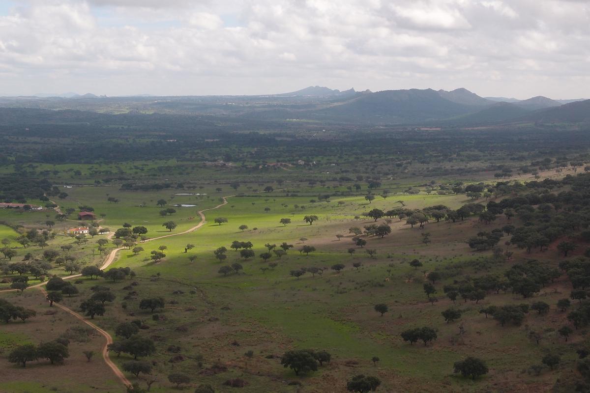 Далекие зубцы хребтов, разгуливающие по лугам пробковые дубы и дорога к замку - все как на ладони. И... нереально красиво.