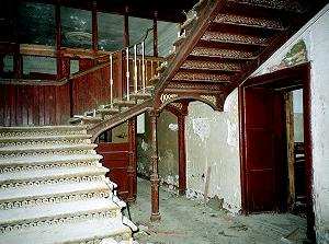 Через главный вход с литыми чугунными колоннами можно войти в дом, где гуляет ветер, капает с потолка, облетает пожухшая краска...
