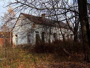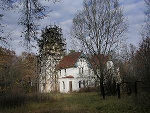 Сразу за воротами - небольшой белый домик, стилистически сильно отличающийся от остальных построек усадьбы. Вероятно, это часовня.