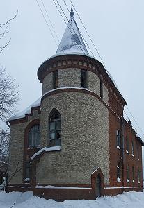 В доме почти не сохранилось оригинальных рам, лишь в башенном окне видно, как оконные переплеты подчеркивали общее стилистическое решение. Над окном видны остатки гнрба Храповицких в виде лилии.