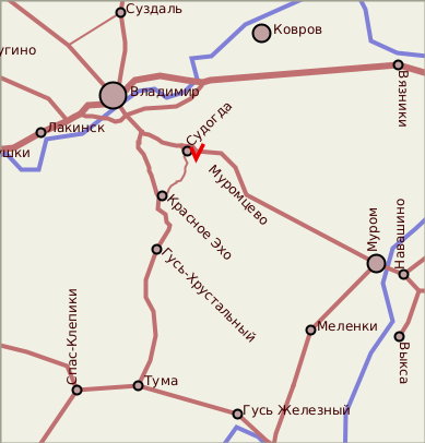 В окрестностях Судогды можно увидеть довольно неожиданные следы прошлого. Широко раскинулись по округе владения богатого еще с советских времен совхоза "Пионер", центральная усадьба которого расположена на территриии бывших владений Владимира Семеновича Храповицкого. Однако стоит лишь немного свернуть в сторону - и перед нами внезапно возникает фантастическое видение...