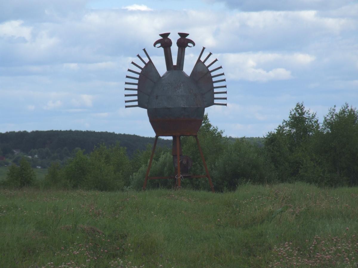 Однако, рядом не менее интересный объект того же автора - "Жар птица" (при участии инженера Владимира Стребня). Это огромное чугунное чудище зимой просто не узнать, языки пламени вырываются из крыльев, клювов и т.п. Экологически чистое пернатое работает на дровах.