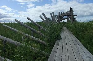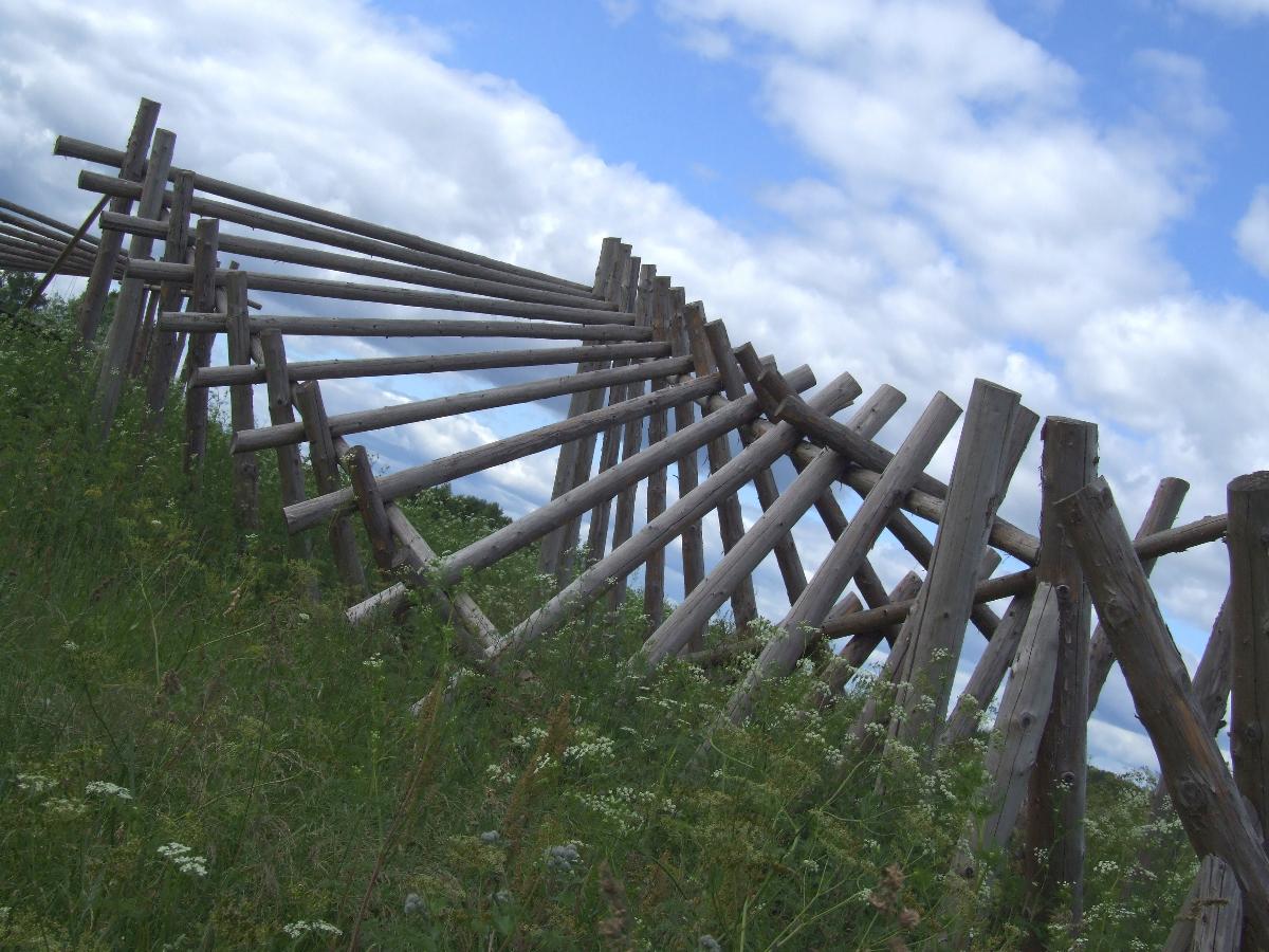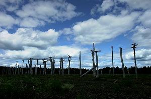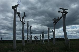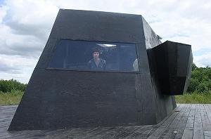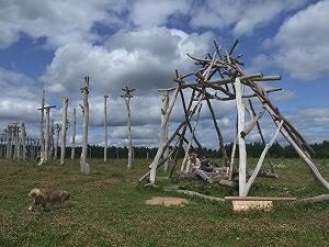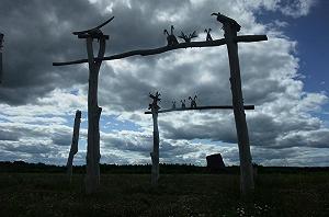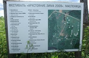 В 1989 году приехал сюда архитектор Василий Щетинин, мечтавший о создании художественного поселка вдали от цивилизации. Его поддержали московский художник Николай Полисский и врач-реаниматолог из института Склифосовского Александр Горячев. Дачники прибывали. С местными жили мирно, даже более того: вместе поддерживали исконно русские традиции. Николаю Полисскому пришла мысль о совместном творчестве, и в 2000 году был реализован первый проект. На высоком спуске к Угре было организовано шествие около двухсот снеговиков. Дождавшись благоприятной для лепки погоды, Полисский дал клич. Из окрестных деревень потянулись мужики с морковками и железными ведрами. В результате на берегу выстроилась армия из двухсот снеговиков в человеческий рост. Фотопрезентация этого проекта состоялась в московских галереях, а летом решено было сложить Вавилонскую башню из сена. Так начиналось то, что сейчас именуется проектом "АрхСтояние" ( с 2006 года мероприятия проводятся 2 раза в год) и финансируется из фонда Владимира Потанина (программа "Меняющийся музей в меняющемся мире"). То, что получилось, производит сильное впечатление. Статичные и подвижные деревянные и металлиxеские конструкции размещены довольно хаотично на огромной территории (берег Угры и близлежащее поле). Первое, что бросается в глаза с дороги называется "Граница империи", а дальше - больше. Жаль только, схема расположения объектов - одна, да и та в кустиках (мы ее обнаружили ближе к концу прогулки). "Павильон шишек" найти не каждый сможет, а ведь 50 кубометров шишек ушло на это грандиозное сооружение нидерландского архитектора Адриана Гезе. Объект "Самонапряженная структура" (придуманный в далеком 1921 году) надо видеть в действии, просто наступив на него. Ну, всего не расскажешь. Лучше приехать и посмотреть своими глазами. Удовольствие получат и взрослые и дети, а уж по части необыкновенного ...