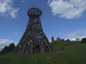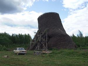 "Гиперболоидная градирня" (тоже проект Н.Полисского) близка к завершению. Местные мужички что-то самозабвенно пилят внутри. Масштабы плетеной корзины впечатляют.