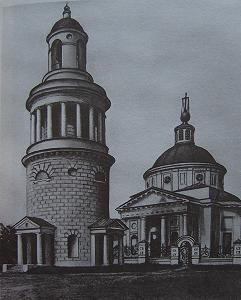 Гораздо интереснее была колокольня, взорванная немцами в 1941 году. На мощную монолитную цилиндрическую нижнюю часть была поставлена изящная круглая колоннада, увенчанная бельведером.