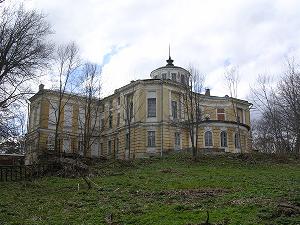 Вид на главный дом из парка поистине великолепен.Полукруглые формы первого и второго этажей венчает изящный бельведер. Интересное архитектурное решение связано с внутренней планировкой дома, где соседствуют прямоугольные, овальные и другой формы комнаты.