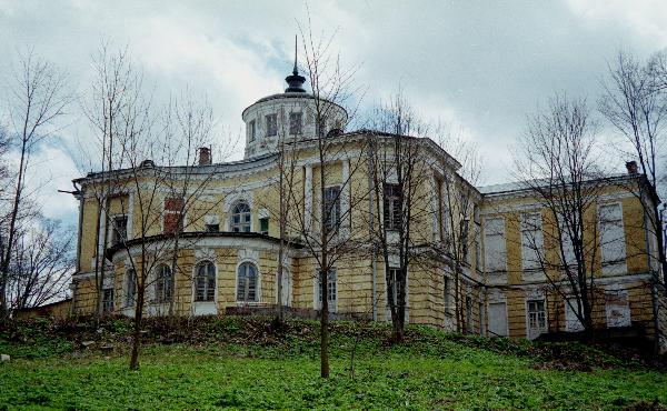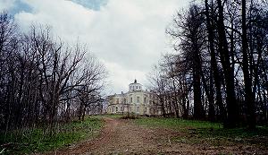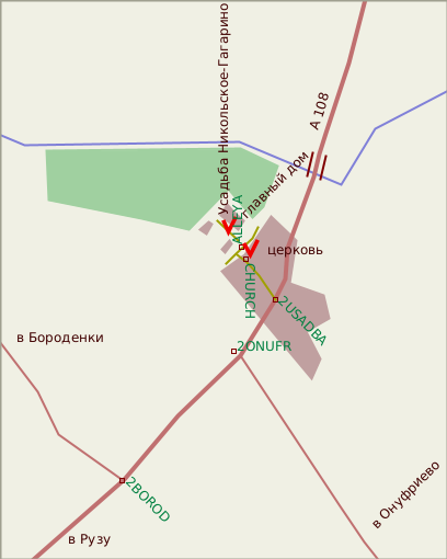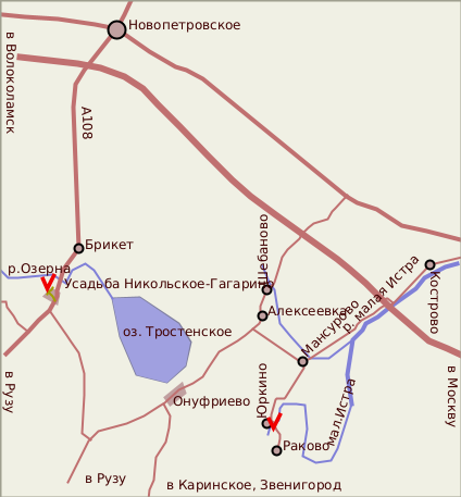 Из Москвы по Рижскому шоссе до пересечения со второй подмосковной кольцевой A108, по ней - налево в сторону Рузы. Перед Никольским шоссе спускается в широкую заболоченную долину Озерны, затем - мост через реку и довольно крутой подъем на высокий левый берег. Поворот с шоссе к усадьбе - примерно в конце подъема, направо (даже чуть назад, путевая точка 2USADBA). Деревенская улица поднимается еще выше, и, перевалив холм, на которм возвышается церковь (она останется справа, путевая точка CHURCH), спускается к Т-образному перекрестку. За прекрестком - уже постройки усадьбы, однако мы, будучи наслышаны о негостеприимных охранниках лечебного уреждения, свернули на перекрестке правее и остановились напротив аллеи (ALLEYA), ведущей через ворота к парадному двору усадьбы.