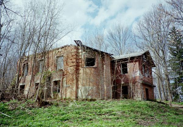 Рядом - неплохо сохранившееся служебное здание с полукруглой стенкой. Следы пожара и провалившаяся крыша говорят о причине нынешнего запустения.
