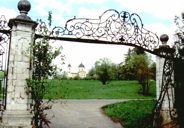 Из дома видна построенная на возвышении Никольская (Владимирская) церковь. Она была сооружена в 1778-1780 гг. под руководством крепостного архитектора Бабакина, предположительно по проекту архитектора К.И.Бланка. В 1835 году к церкви были пристроены два боковых придела (по пректу А.О.Жилярди). Ограда, сквозь которую видна церковь, выполнена в XIX веке по эскизам известного петербургского архитектора Боссе.
