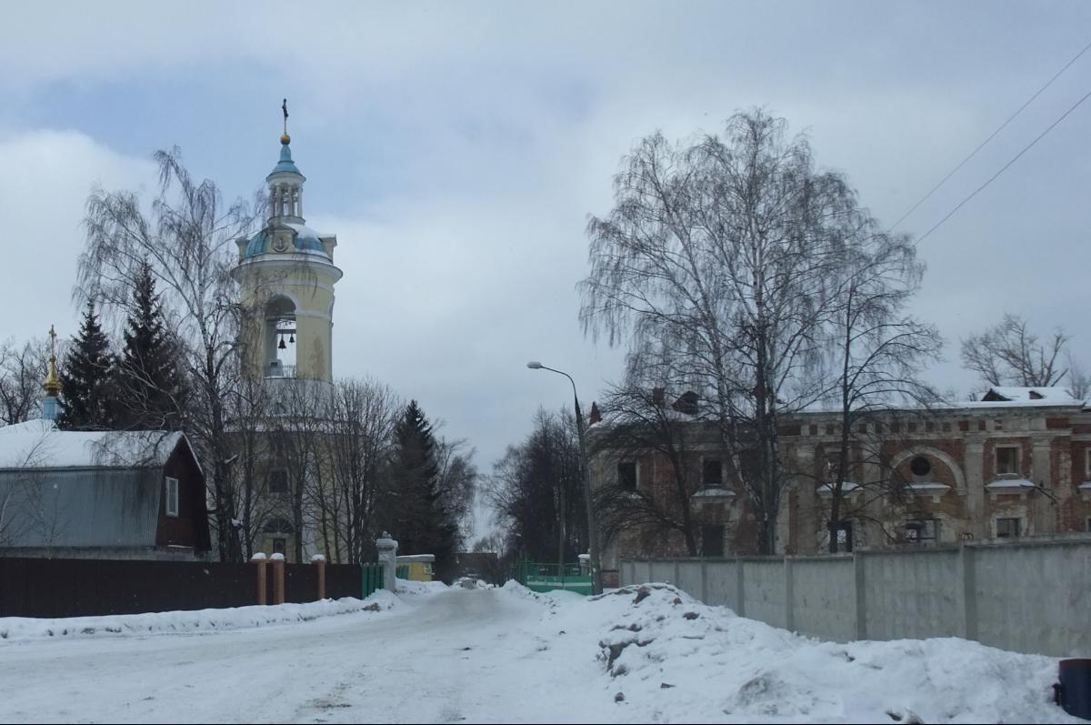 Дорога от усадьбы в село проходит между храмом Петра митрополита и отдельно стоящей колокольней с пристроенной к ней теплой Покровской церковью. Разница в нынешнем состоянии разрушающегося бесхозного храма и действующей церковью разительна.