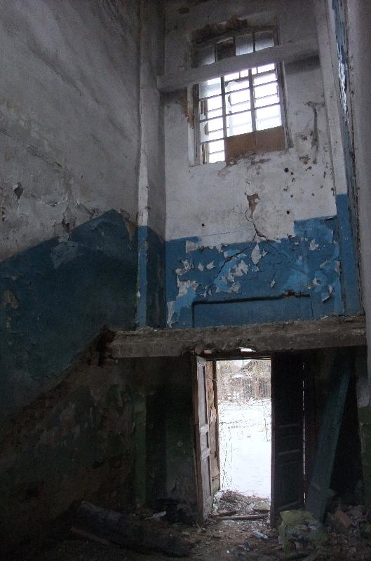 О внутреннем убранстве помещения судить трудно. В торцах располагались лестницы с витражными окнами и боковыми входами.