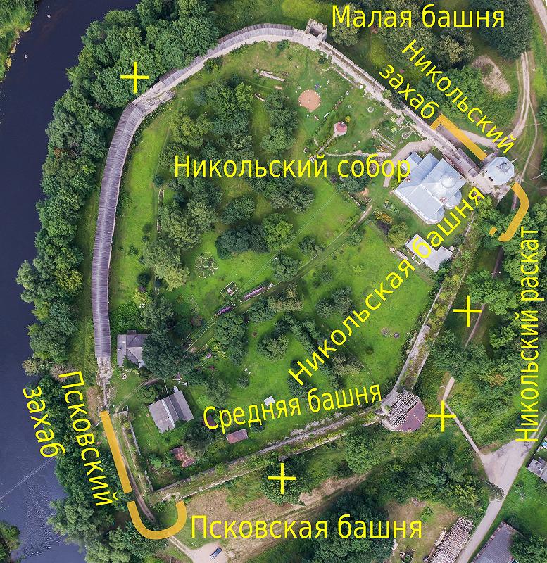 Чтобы было понятно, о чём идёт речь, приведём аэрофото Порховской крепости (взятое отсюда), на котором мы схематически нанесли