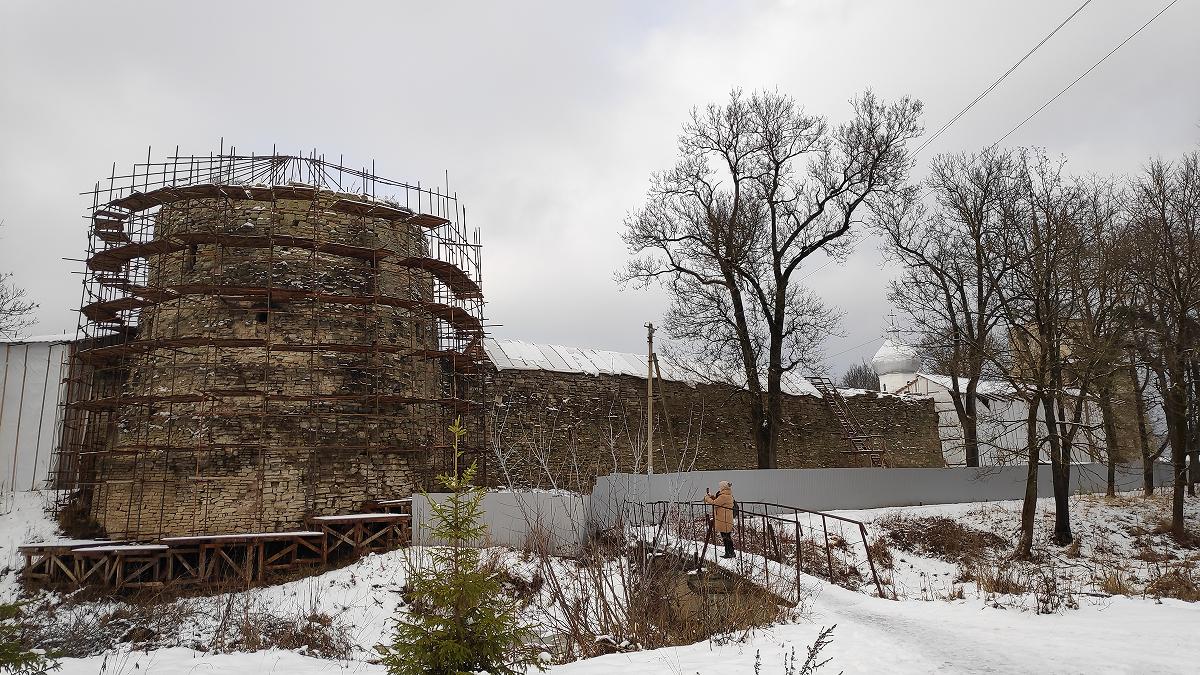 У Средней башни мы расстанемся с крепостной стеной и, перенося точку съёмки по траектории стрелы, пущенной воображаемым защитником крепости, окажемся снаружи на мостике через крепостной ров (или овраг?). Где-то недалеко, вероятно, стоял злосчастный полоцкий воевода, в которого угодил на излёте выстрел Галки. И сейчас вид отсюда весьма неопрятный из-за лесов и прочей атрибутики, символизирующей процесс реставрации. Это самая укреплённая и самая внушительная часть Порховской крепости, надеемся, что когда-нибудь мы увидим её во всей красе.