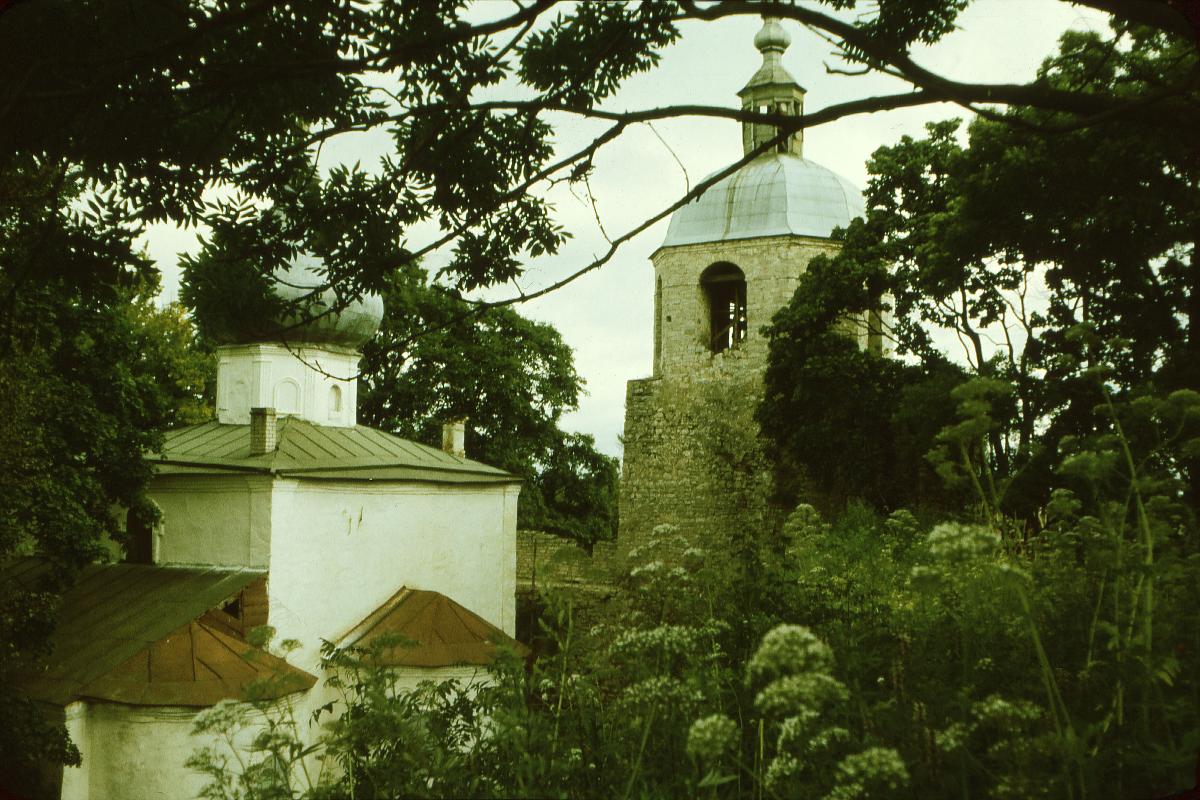 Колокольня, возведённая на Никольской башне в начале XIX века (она на дальнем плане фотографии), раньше стояла прямо на самой стене "против алтаря приделанной церкви св. Архистратига Михаила" [Лебедев, 1887, с.16]. Алтарная апсида этого придела на фото - левая, ближайшая к зрителю, так что место старой колокольни на стене можно представить себе достаточно точно.