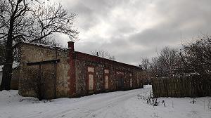 Напротив мостика - симпатичный каменный сарайчик, фигурирующий в списке объектов культурного насления Псковской области под названием "Склад купеческий XIX в." (проспект 25 Октября, 11-а). Углы этого сооружения и прочие ответственные части сложены из кирпича, стена - красивая булыжная кладка, похожую можно обнаружить в хозяйственных постройках соседних Холомков или в усадьбе Полоное, что в нескольких километрах отсюда. А в кладке торцевой стены виден знакомый известняковый камень, который в то время, вероятно, в обилии встречался под стенами разрушающейся крепости и образовывался в результате разборки "ветхих" её частей.