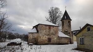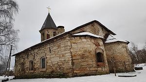 Напротив старого городища, на высоком левом берегу Шелони, стоит древняя церковь Рождества Богородицы. Известно, что в 1584 году здесь был женский монастырь [Лебедев, 1887, с.17], и, вероятно, храм монастырский изначально. Существует предположение, выдвинутое по результатам обследования церкви в 1992 году [Седов, 2001], что временем её постройки могло быть начало XIV или даже конец XIII века. И.В. Антипов склоняется в пользу более поздней датировки - середина - третья четверть XIV века [Антипов, 2013], но, в любом случае, ранее каменной Порховской крепости.