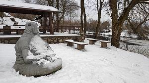 А по соседству, чуть выше по реке, обосновалось дитя совсем другого века - бетонный Ждун, которого хочется назвать каменным, ибо так психологически точнее (бетон ведь - тоже камень, разве что искусственный). Ждун появился здесь по инициативе главы администрации Порховского района Виктора Степанова, а создал его местный скульптор Александр Григорьевич Бурилов [Громова, 2017].