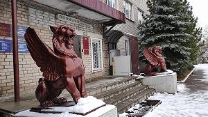 Продолжение темы заслона, или, может быть, охраны, неожиданно обнаруживается совсем на другом конце города (улица Пушкина, 43). Грифоны, привезённые сюда из расположенной неподалёку усадьбы Строгановых Волышово, охраняют отдел полиции, а полиция - охраняет грифонов, которые на своём историческом месте рисковали бы угодить в металлолом. Такая вот взаимовыгодная охрана, хотя и существующая в несколько различных планах действительности.