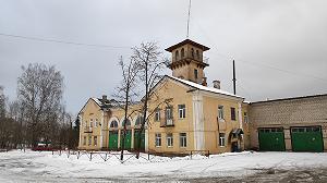 Если от "купеческого склада" выйти на проезжую дорогу, перед нами предстанет увенчанное каланчой пожарное депо. Что-то притягательное есть в его изящной симметрии и стройности, которые это сооружение, похоже, осознаёт, взирая с достоинством на грубые и "варварские" крепостные стены. А длиннющая, чуть откинутая назад, антенна гордо вздымается над каланчой этаким плюмажем. К счастью, Порхов остался в основном малоэтажным городом, и такие доминанты делают его ещё очаровательнее.