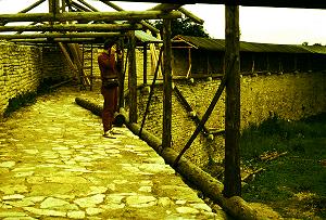 У Средней башни мы расстанемся с крепостной стеной и, перенося точку съёмки по траектории стрелы, пущенной воображаемым защитником крепости, окажемся снаружи на мостике через крепостной ров (или овраг?). Где-то недалеко, вероятно, стоял злосчастный полоцкий воевода, в которого угодил на излёте выстрел Галки. И сейчас вид отсюда весьма неопрятный из-за лесов и прочей атрибутики, символизирующей процесс реставрации. Это самая укреплённая и самая внушительная часть Порховской крепости, надеемся, что когда-нибудь мы увидим её во всей красе.
