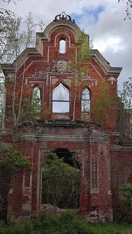 На восточном фасаде фигурный фронтон над балконом украшен овальным барельефом с гербом князей Голицыных. Белая рельефная лепнина все еще эффектно выделяется на фоне кирпичных стен, вызывая удивление своей прочностью и прихотливым орнаментом. С юга и востока дом окружала белокаменная терраса с шарами на мощных столбах и чугунная ограда.