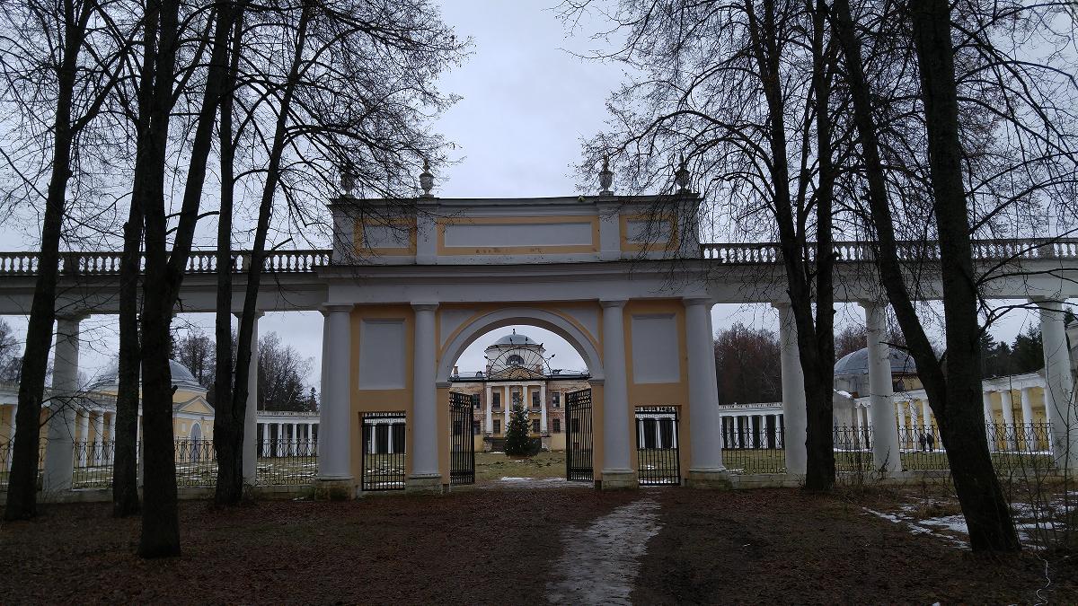 Дворцово-парковый ансамбль находился в двух верстах от столбовой дороги Москва - Петербург. К главному дому вела подъездная аллея, завершавшаяся триумфальными воротами с элегантными каменными вазами на аттике.