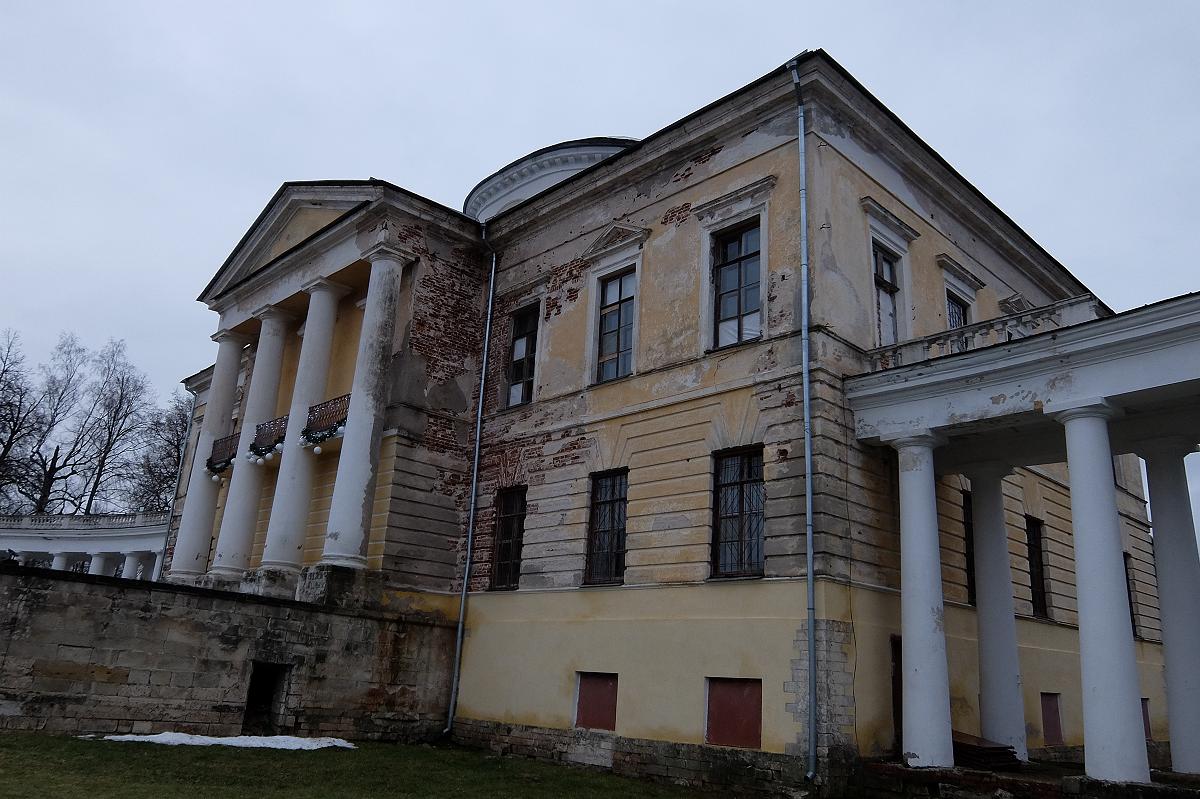 Главный дом украшен четырехколонным портиком, который перекликается с колоннадой. По желанию владельца Н.А. Львов декорировал усадьбу элегантно, но строга. Сам архитектор писал "Украшение только то у места, которое вид надобности имеет: