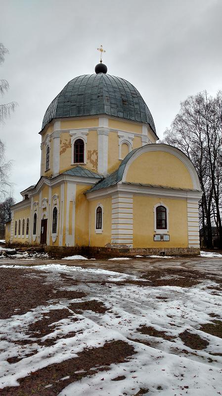 Чуть сбоку от главного дома стоит Знаменская церковь, постороенная немногим ранее главного ансамбля. Первоначально при ней было кладбище, но при строительстве дворцово-паркового ансамбля решено было его перенсти в соседнюю деревню Васильева гора, где по проекту Н.А. Львова построили часовню.