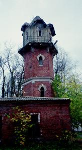 Водонапорная башня, построенная при последнем владельце Сахарова, пример архитектуры эклектики романтического направления. Узкие стрельчатые окна украшают три восьмигранных яруса башни. Балкон верхнего яруса опирается на изящные кронштейны, над окнами - щипцовые кровли.