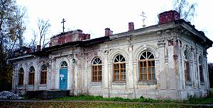 Самая известная из сохранившихся построек Сахарова - церковь-усыпальница, расположенная северо-восточнее бывшего хозяйственного двора. Строилась она в 1895-1898 гг., возможно по проекту Л.Н.Бенуа. Первоначально в ней собирались разместить домашний музей ("картинный дом"). Наверно поэтому кирпичное оштукатуренное здание на белокаменном цоколе скорее напоминает парковый павильон или оранжерею.