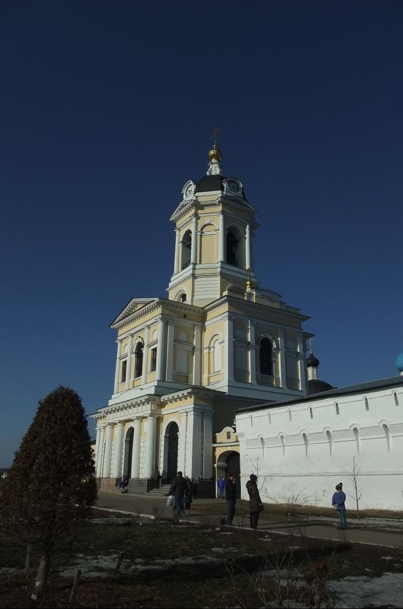 Надвратная трехъярусная церковь-колокольня Трех Святителей была сооружена по проекту 1828 года на месте рухнувшей предыдущей каменной постройки. Сейчас в действующий мужской монастырь можно попасть, пройдя сквозь строй опустившихся местных жителей, требующих подаяния "во славу Господа". Юбки, платки, не фотографировать - об этом предупреждает дюжий охранник при входе.