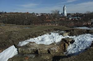 Каменная стена с башнями опоясывала весь кремлевский холм по периметру, о чем свидетельствуют раскопки.