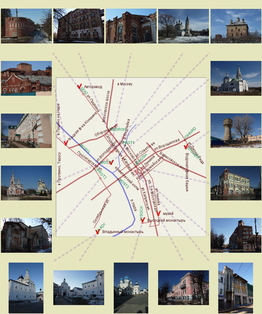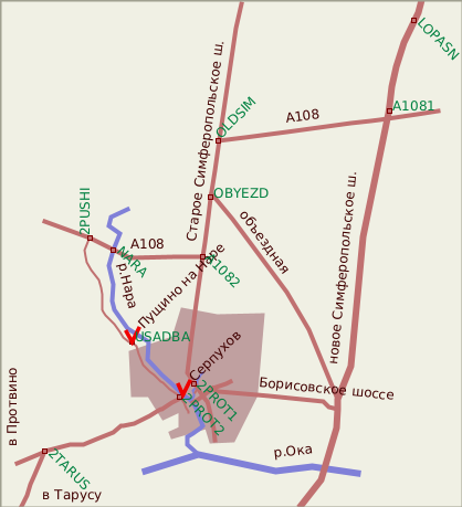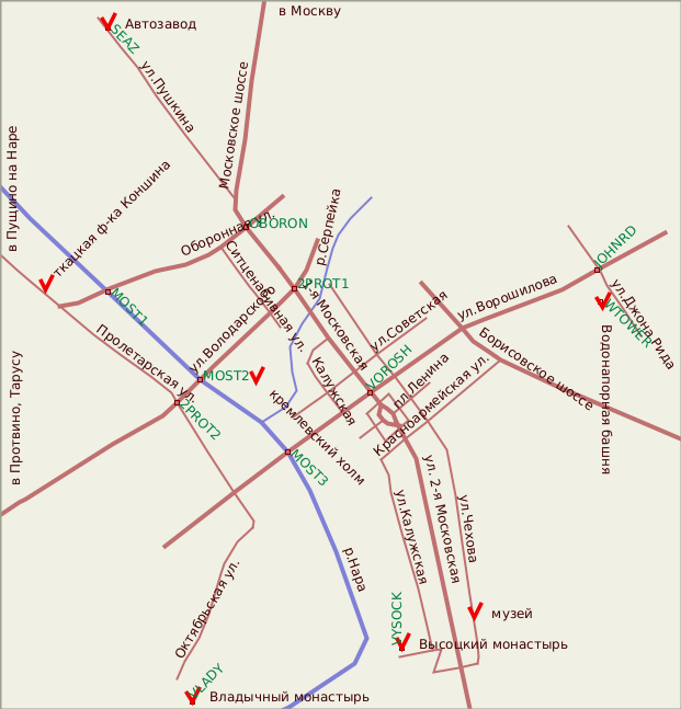 Со стороны Москвы удобнее въезжать в город по старому Симферопольскому шоссе, переехав на него с трассы "Крым" по второй "бетонке" (А108). Надеемся, приведенная схема поможет сориентироваться в самом городе. Нужно учитывать также, что сквозного проезда по Калужской улице нет - со стороны Высоцкого монастыря можно доехать до пересечения с Красноармейской, дальше проезд закрыт каким-то милицейским учреждением. На некоторых планах города не обозначен мост через Нару, соединяющий Оборонную улицу с Пролетарской (на правом берегу). Для удобства в файл путевых точек включена усадьба Пущино-на-Наре (о ней - отдельный сюжет "Проселков"). Из Серпухова проезд к усадьбе -на север по Пролетарской улице.