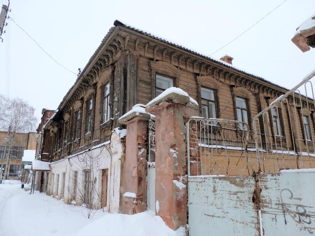 Рядом - наполовину деревянный дом, украшенный изысканой стильной резьбой.