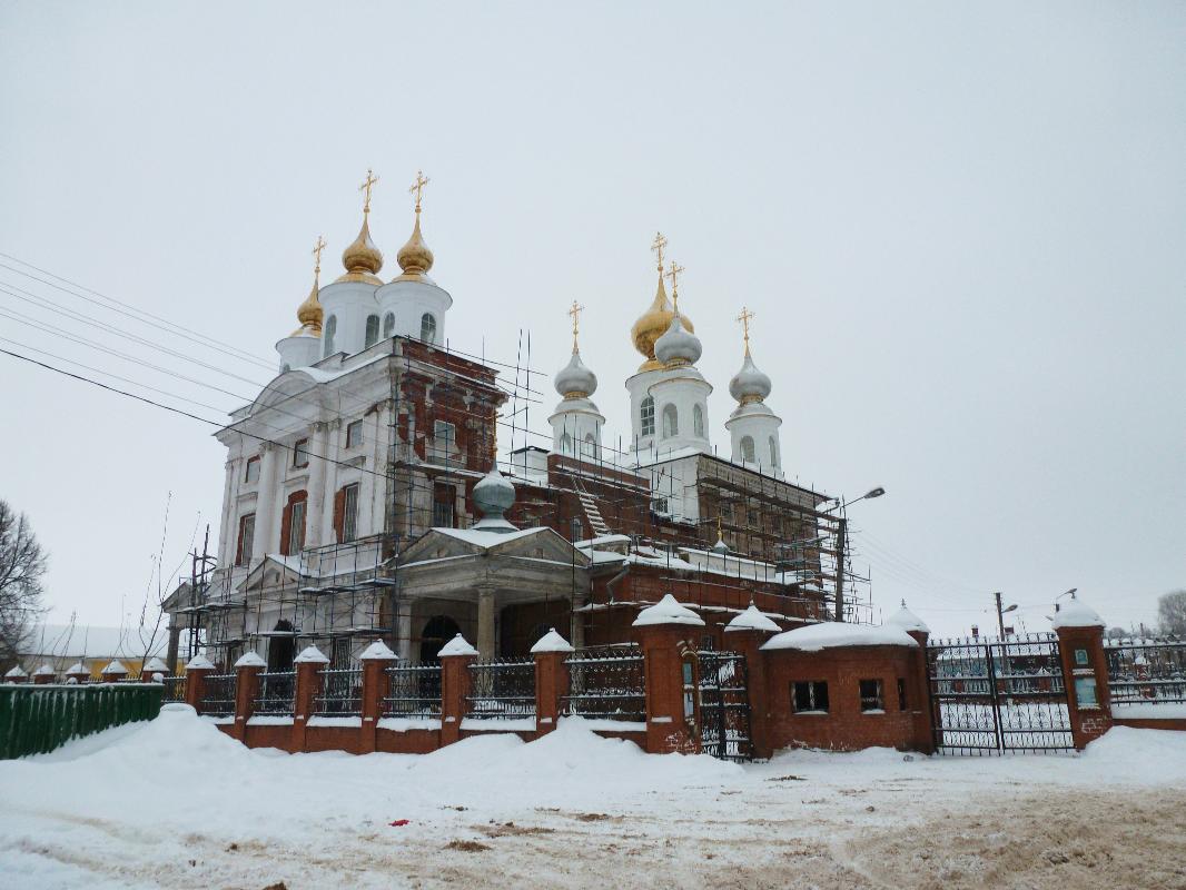 Воскресенский собор был построен в самом конце XVIII века. Он почти скрыл за собой более ранний Никольский собор, стоящий на самой кромке долины Тезы.
