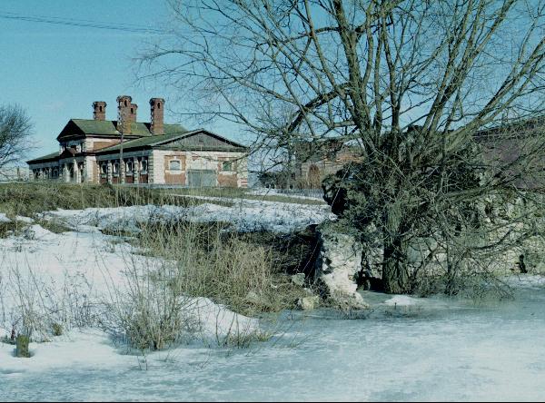 Выйдя из дома к пруду, можно было подняться в беседку над гротом. Сейчас их руины за деревом на фоне конюшни можно легко принять за груду мусора.