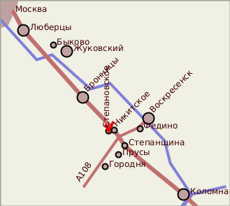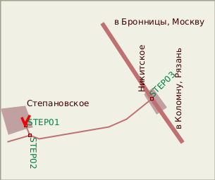 От Москвы по Рязанскому шоссе.Проехав Бронницы и не доезжая километров четырех до большого подмосковного кольца ("бетонки")A-108, в селе Никитское, нужно повернуть направо(указателя нет). Далее по местному узкому шоссе еще километра три.