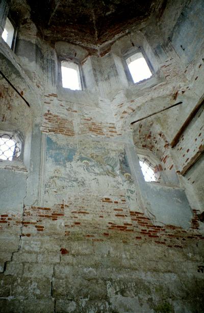 Посмотрев вверх, не веришь глазам своим. Будто стоишь в шатровой церкви и смотришь на остатки старинных росписей. На самом деле снаружи - типичный восьмерик на четверике.