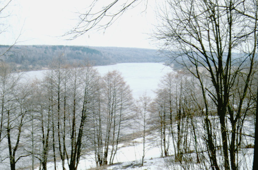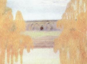 В 1905 году, незадолго до смерти, написал В.Э.Борисов-Мусатов "Осеннюю песнь", про которую сам говорил: "Вот "Березы осенью" - две пожелтевших березы на фоне синей реки. Но мне хотелось выразить именно музыку умирания природы". Еще один прекрасный вид Оки, так часто вдохновлявшей художников своей непередаваемой красотой.