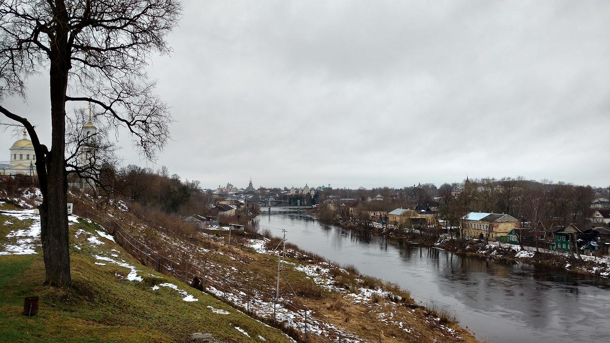 С круч левого берега, за музеем Пушкина, открывается панорама города. Внизу напротив - купеческое правобережье, а вдали, там, где река уже подбирается к горизонту, видны постройки Борисоглебского монастыря. Слева на фото с краю, на нашем берегу, видна Ильинская церковь, стоящая при трехлучевом разветвлении дорог. Туда - продолжение нашей виртуальной прогулки.