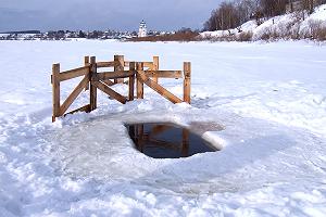 Но, конечно, самая большая достопримечательность и гордость Тотьмы - река Сухона. Вода в проруби выглядит кристально-чистой (хотя экология реки небезупречна, причина - целлюлозно-бумажный комбинат в поселке Сокол в верховьях Сухоны).