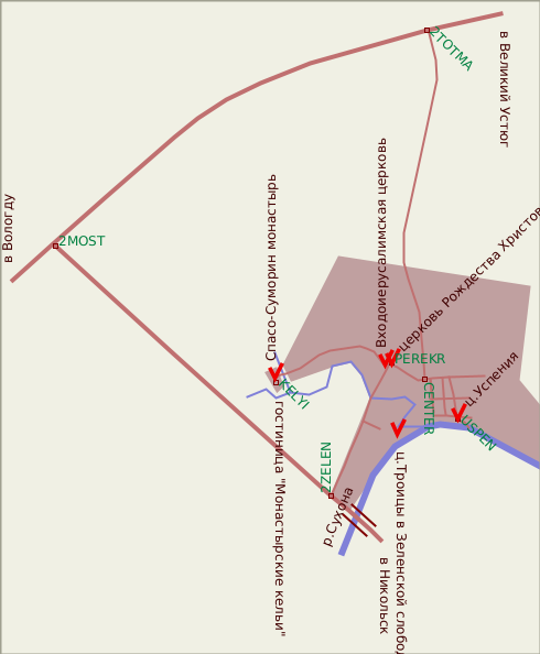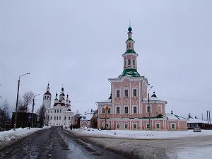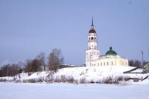 Немного истории. Первоначально (год основания - 1137) поселение располагалось ниже по течению Сухоны, но с появлением соляных варниц при впадении речек Ковда и Песья Деньга в Сухону, городок переместился на нынешнее место. В XVI веке посад Соль Тотемская был уже крупным населенным пунктом. Вываркой соли заправляли здесь Строгановы, при них городок обзавелся несколькими деревянными церквями. Крупным производителем соли был и расположенный рядом Спасо-Суморин монастырь (о нем отдельный сюжет на сайте). В повести о Феодосии Тотемском, написанной в 1550-х годах, сказано: "Переселяхуся людие из старого посада от варниц на берег Сухоны реки иде же ныне стоит город Тотьма". В это время строится кремль, торговые ряды, причалы для судов.Во временя опричнины Тотьма вошла в состав опричных земель, Иван Грозный побывал здесь несколько раз. Один из районов Тотьмы, где по преданию стояли царские шатры, до сих пор носит название Государев луг. В Смутное время жители города вначале целовали крест Лжедмитрию, но разобравшись в ситуации, отказались от крестного целования и послали свои полки для поддержки ополчения. После окончания польско-шведской интервенции в Тотьме была проведена перепись, по которой в городе насчитывалось 20 церквей, 199 дворов и 8 соляных варниц. Позднее жители города принимали активное участие в торговле с Англией, получив значительные льготы. Петр I не раз посещал Тотьму, изучал принцип работы соляных варниц, собственноручно вытаскивая бадьи с рассолом. Место понравилось царю и он стал ссылать сюда опальных бояр. Воеводой был посажен отец первой жены Петра - Ф.А.Лопухин. XVIII век стал временем расцвета для Тотьмы. Строились каменные храмы, дома, лавки, амбары. Этому косвенноспособствовал и пожар 1743 года, уничтоживший пол города. После чего был отстроен каменный Богоявленский собор (1744-1749). Он был капинально перестроен в духе раннего классицизма в 1816-1822 годах по проекту архитектора И.А.Фохта. А в 1863-1868 годах вновь подвергся перестройке по проекту ключаря вологодского Успенского собора П.В.Иконникова. В отличие от этого собора остальные церкви XVIII века сохранились почти без изменений. Определяют лицо города два стоящих недалеко друг от друга барочных храма: Входа в Иерусалим и Рождества Христова. Церковь Рождества Христова - действующая, а во Входоиерусалимской располагается музей мореходов. Тотьма славилась своими моряками. На средства местных купцов снаряжались экспедиции на Аляску (один из кораблей даже назывался "Тотьма"). Отсюда родом был и Иван Кусков, достигший берегов Америки в 1789 году, а в 1812 основавший русское поселение в Калифорнии - Форт-Росс. Знаменитый мореход похоронен на кладбище Спасо-Суморина монастыря. Рядом с Входоиерусалимским храмом не сразу замечаешь остатки церкви Иоанна Предтечи, построенной в 1738-1740 годах по заказу секретаря великоустюжской консистории И.Г.Фирсова. От XVIII века сохранились еще Воскресенская и Успенская церкви. Интересно здание присутственных мест, построенное в конце XVIII - начале XIX века. Богатая отделка придает ему какой-то вовсе не казеный вид. В 1780 году город получил статус уездного и герб.
