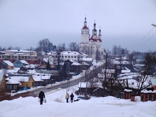 Однако постепенно Тотьма превращалась в захолустный провинциальный город, став, к тому же, в XIX веке местом политической ссылки, где в разное время побывали П.Л.Лавров, В.Г.Короленко, А.В.Луначарский. Отсутствие "серьезных" промышленных предприятий до сих пор является отличительной особенностью Тотьмы. Чем живут? Лесопромышленный и агропромышленный комплекс. И живут, судя по домам и автомобилям, не так уж плохо. Все вокруг чистенько, уютно, покрашено. Храмы да разбросанные по берегам Сухоны домишки и определяют облик города. Но самое главное - река. Большая, красивая, с высокими берегами, зимой - с прорубью для стирки белья. И стирают, и везут на санках. А вокруг белоснежный город да маковки церквей.