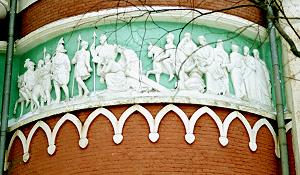 Немного неожиданный здесь неоклассический элемент декора, широкая полоса скульптурного фриза, выполнен скульптором-академиком Г.Т.Замараевым.
