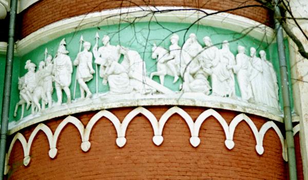 Немного неожиданный здесь неоклассический элемент декора, широкая полоса скульптурного фриза, выполнен скульптором-академиком Г.Т.Замараевым.