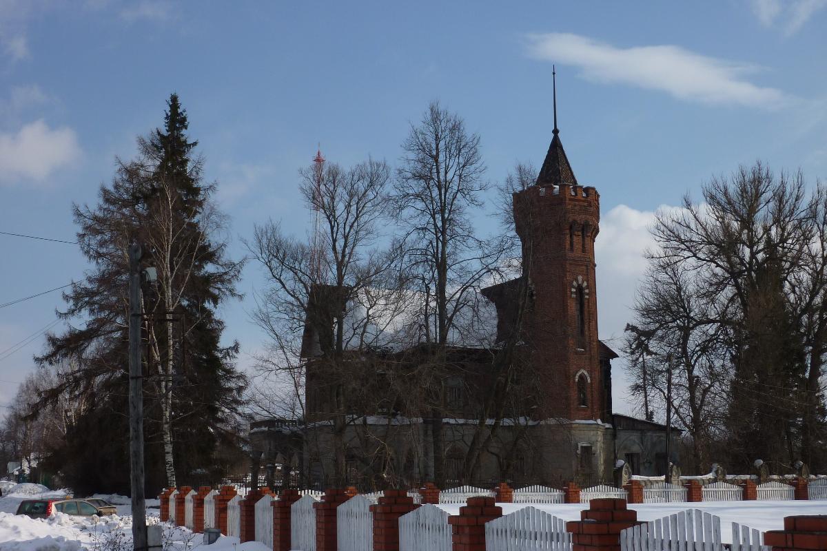 Особую эффектность главному дому придает западная восьмигранная башня, украшенная сверху поясом зубцов на машикулях. Завершается башня шатром из поливной черепицы.