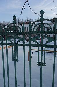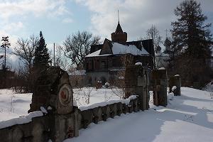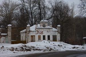 Рядом - дом управляющего. Первый этаж - кирпичный, второй - бревенчатый, обшит тесом. На втором этаже сбоку - балкон с решеткой в виде крыльев бабочки.