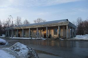 При входе поставили одноэтажную сторожку с вальмовой кровлей и поперечным коньком. На флангах - два входа для рабочих. Средняя часть фасада украшена высоким аттиком с часами.